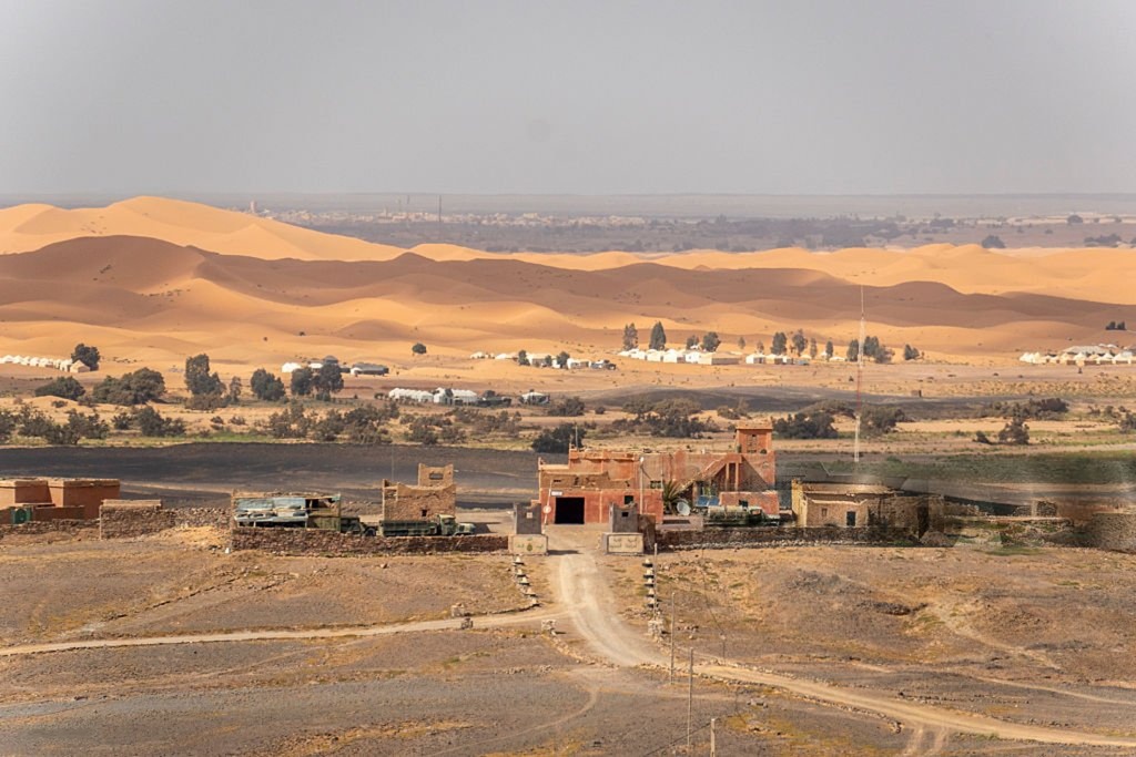 Leave Fes early for the journey to the Sahara. Drive through the Middle Atlas Mountains, stopping in Ifrane, known for its alpine architecture, and the Cedar Forests of Azrou to see Barbary macaques. Enjoy lunch in Midelt before the landscape transforms. Descend through the dramatic Ziz Gorge and past the vast Ziz Valley oasis to reach the dunes of Merzouga. Here, switch to camels for a trek into the Erg Chebbi dunes to witness a spectacular sunset. Arrive at your desert camp for a traditional dinner under the stars.
